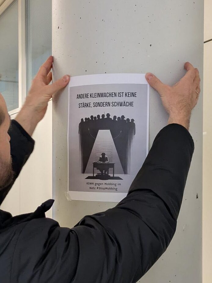 Mit klaren Botschaften und eindrucksvollen Slogans machen die Auszubildenden der Klasse 3KA2 im dritten Lehrjahr als Automobilkaufmann/-frau derzeit auf ein hochaktuelles Thema aufmerksam: Gefahren und Diskriminierung im Internet. Im Rahmen ihrer Projektkompetenz entstand die Aktion unter dem Titel „KSWN gegen XX im Netz“.