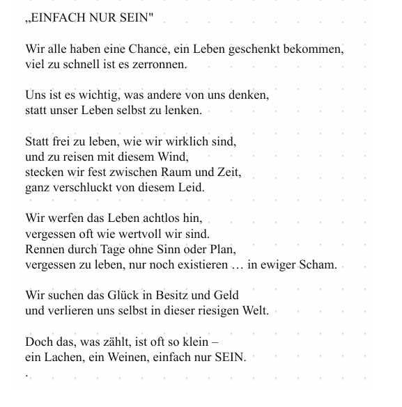 Wenn Worte berühren, Gedanken lenken und Bilder im Kopf entstehen, dann hat Sprache ihr Ziel erreicht. Genau das gelingt unserer Schülerin Eva Noe aus der Klasse 12/5, deren Gedicht „Einfach nur sein“ in der renommierten „Frankfurter Bibliothek“ veröffentlicht wird – Die FRANKFURTER BIBLIOTHEK ist mit etwa 50.000 veröffentlichten Gedichten das umfangreichste Lyrik-Standardwerk der deutschsprachigen Buchhandelsgeschichte.