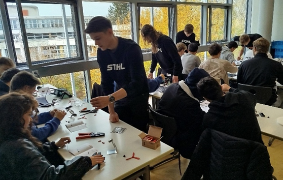Schülerinnen und Schüler testen ihr handwerkliches Geschick bei der Firma Stihl