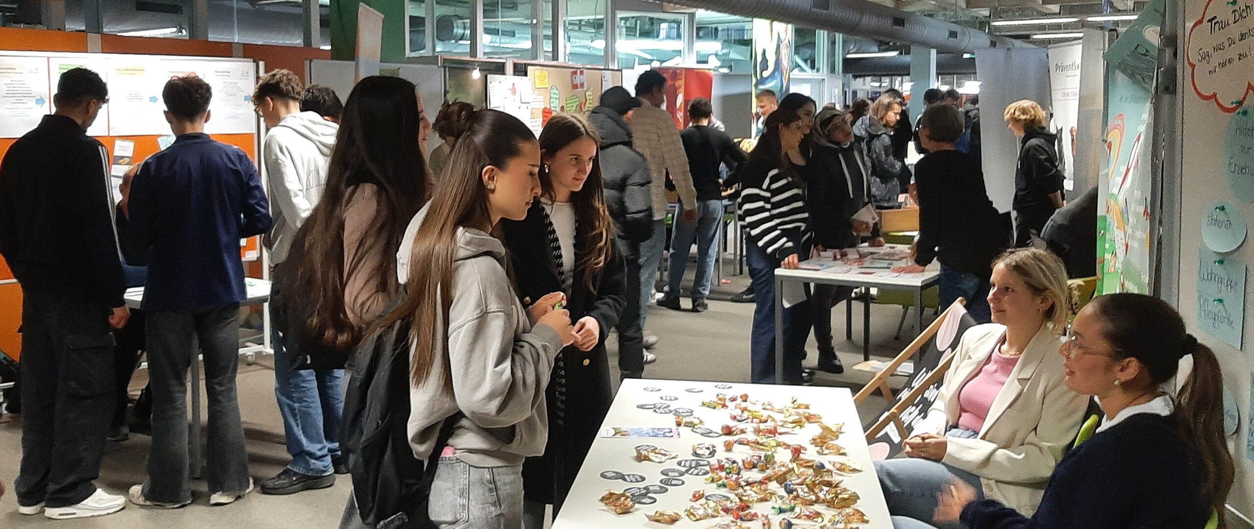 „Ihr wisst ja, wie das Leben so funktioniert. Mal läuft es gut, mal nicht so gut. Wenn Probleme auftauchen, ist wichtig zu wissen, wo man Hilfe findet“, begrüßt unser Zentrumsjugendsozialarbeiter Peter Gericke unsere Klasse AVD 2 beim diesjährigen „Sozialen Markt“ an unserem Berufsschulzentrum. Zusammen mit seiner Kollegin Elisabeth Laenger hat er so viele Institutionen wie nie für den „Sozialen Markt“ gewinnen können. Experten und Expertinnen von 20 Institutionen ermöglichten den Jugendlichen über Quizfragen, Spiele und kleine Giveaways, ihre Hilfsangebote kennen zu lernen. Auf diese Weise wurde den Schülerinnen und Schülern die Kontaktaufnahme leicht gemacht. Dies war dem Team der Jugendsozialarbeit besonders wichtig. Ob Schwangerschafts-, Drogen-, oder Schuldnerberatung, viele Angebote waren den rund 250 Schülern und Schülerinnen unserer Schule, die am Dienstagvormittag die Veranstaltung besucht haben, so noch nicht bekannt.